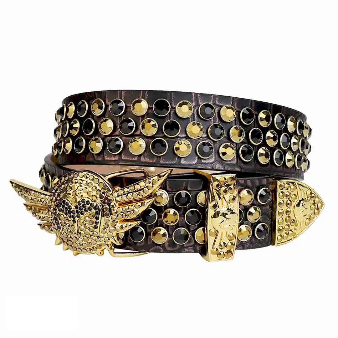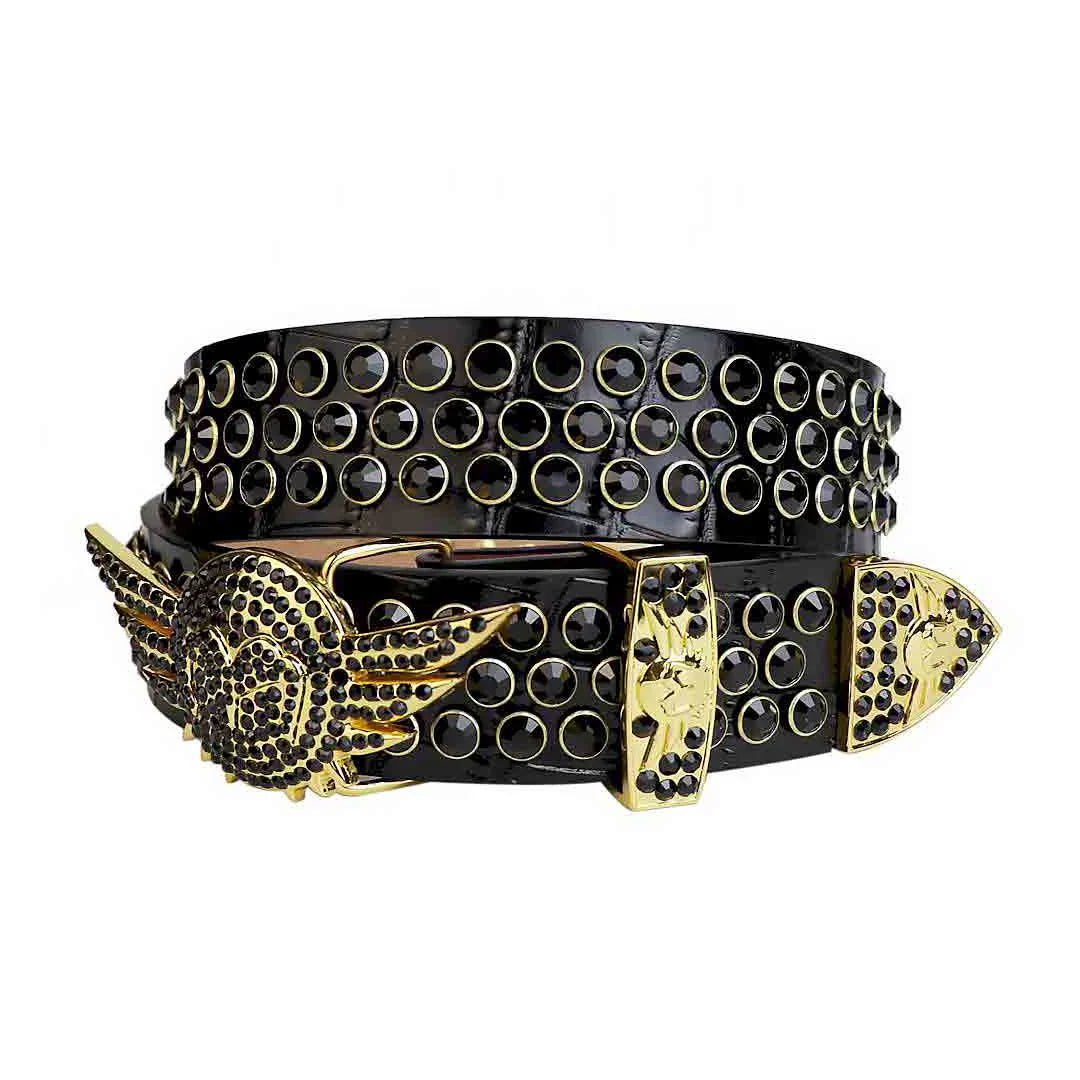 Black and Golden Angel Wings Buckle Rhinestone Belt with Black Strap