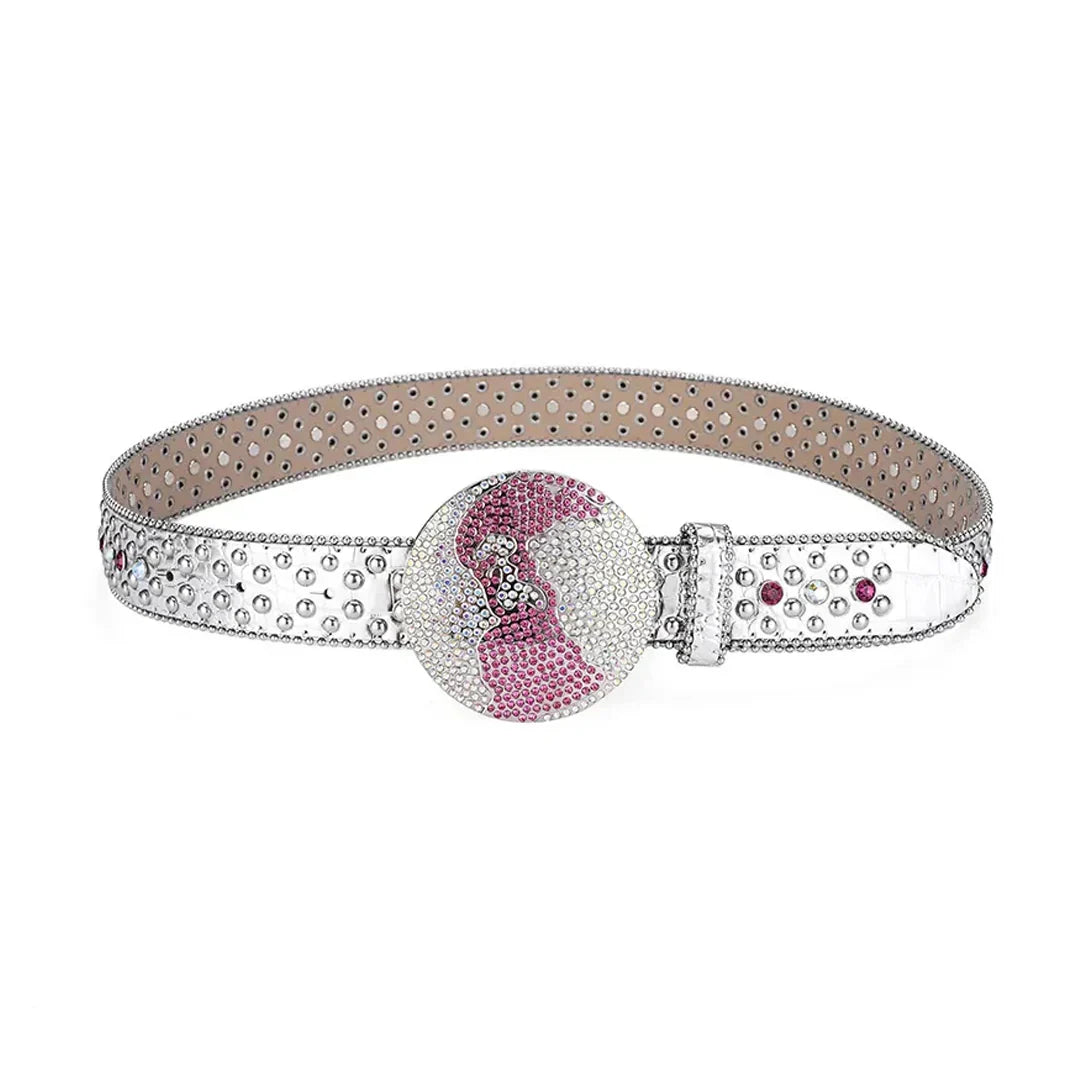 Bling for days with a pink-and-crystal world map, making this chic rhinestone belt a blend of luxury and whimsy.